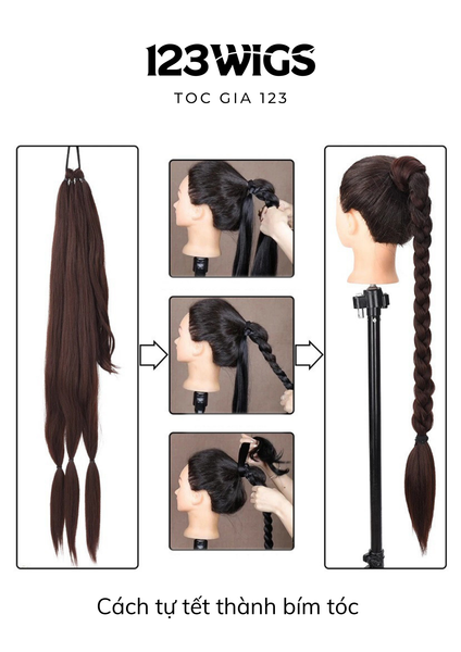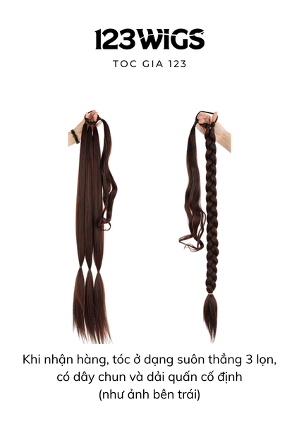 - Dùng 3 lọn tóc sẵn để tự tết bím, hoặc để suôn tự nhiên rồi quấn phần dây quanh gốc để che nút buộc.