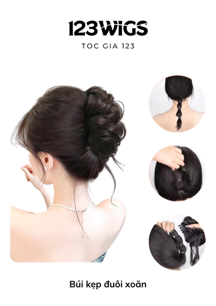 - Kẹp búi tóc giả lên vị trí mong muốn (cao hoặc thấp).