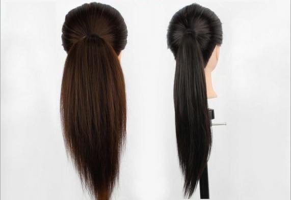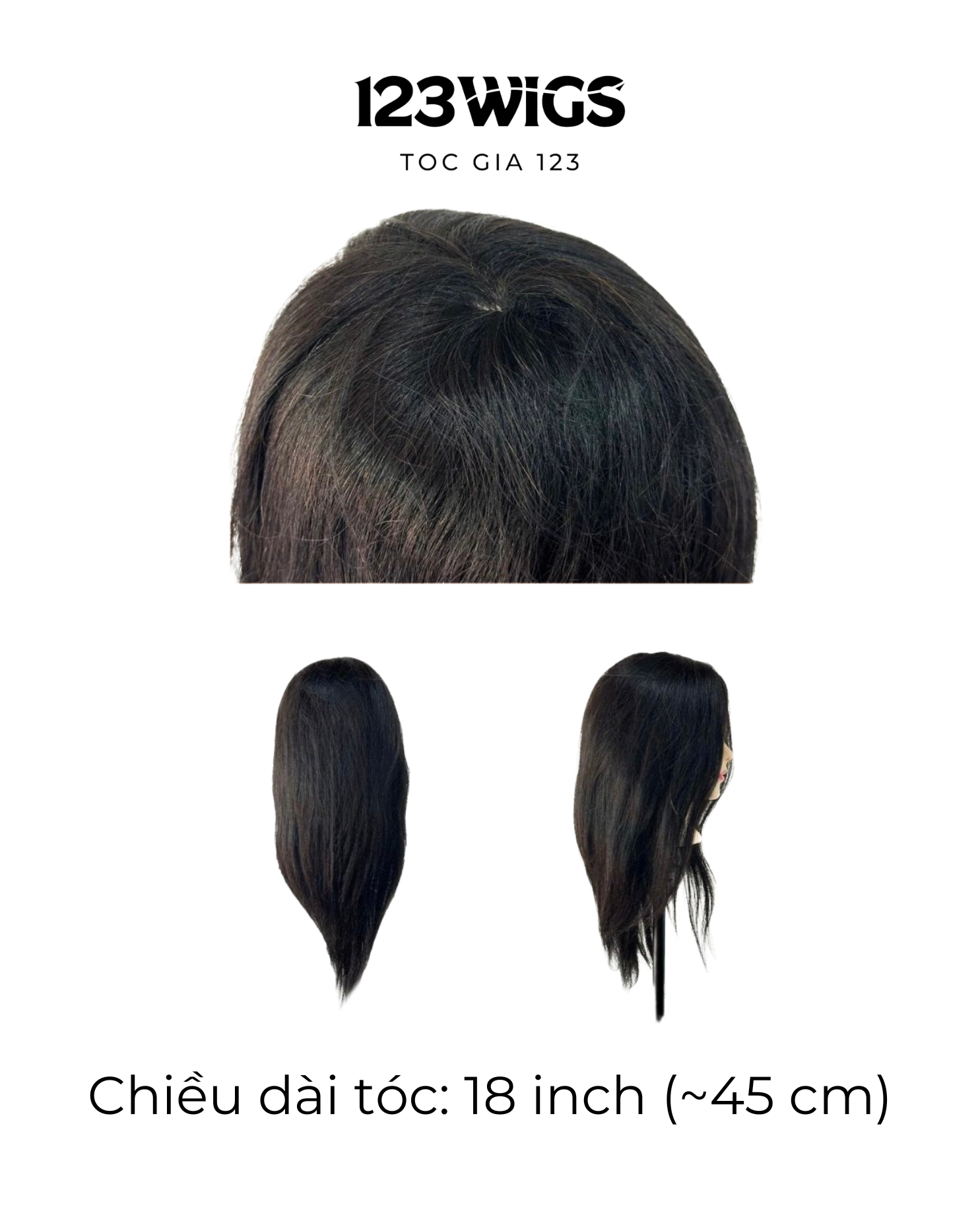 Chất liệu tóc: 80% tóc thật – 20% sợi tổng hợp Độ dài phổ biến: 16 - 18 inch (40 - 45cm) Màu sắc: Đen / Nâu Mật độ tóc: dày vừa, sợi mềm, dễ vào nếp Kết cấu: tóc thẳng tự nhiên, dễ quan sát form cắt